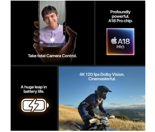 - THE POWER OF A18 PRO—A18 Pro chip enables advanced photo and video features like Camera Control, and delivers exceptional graphics performance for AAA gaming.