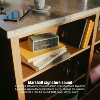 - MARSHALL SIGNATURE SOUND: Emberton III delivers rich, full Marshall signature sound that'll never let you down. Featuring Dynamic Loudness, each frequency is constantly adjusted when you change the volume, ensuring that the tonal balance is always right. But this speaker really gets a kick from being turned up loud. With an even bigger bass than its predecessor, it’ll inject your favourite songs with a whole new level of power, especially at max volume.