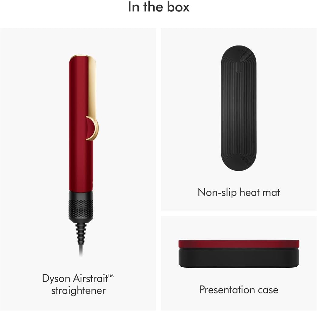 Revolutionize your hair routine with the Dyson Airstrait HT01 Straightener in an exclusive Red Velvet Gold finish. Designed to straighten hair directly from wet to dry, this innovative styling tool eliminates the need for traditional hot plates, reducing heat damage while delivering smooth, natural-looking results. Powered by a high-performance 1600W motor, the Airstrait uses precision airflow to dry and straighten hair simultaneously, saving time without compromising hair health.